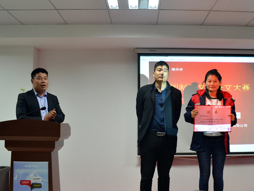 瑞華制冷工程部總經(jīng)理陳現(xiàn)富頒布微信文章“創(chuàng)作名星”獎,榮獲此獎項(xiàng)的是銷售部陳鳳銘。