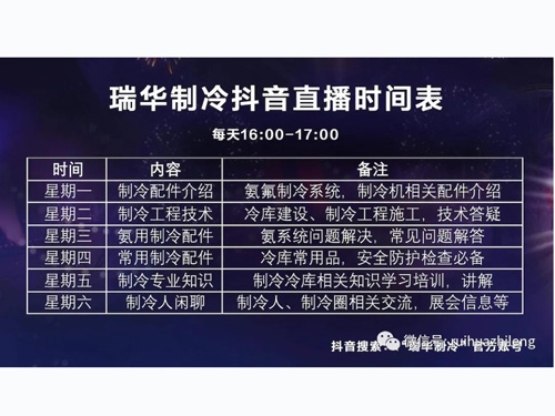 2022年瑞華制冷快速打造了直播團隊及直播室,采購了專業(yè)設備,為大家講解制冷知識、氨氟制冷安全、制冷工程答疑等,以后每天16:00定時開播,每天一小時,與大家共同探討制冷相關(guān)問題,歡迎大家關(guān)注,抖音搜索“瑞華制冷”關(guān)注即可進入直播。