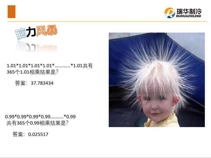 會(huì)議最后,我們一起做了一下兩道題,1.01的365次方和0.99的365次方, 表面上看1.01和0.99只相差0.02,實(shí)在是微乎其微,不足道哉,但是當(dāng)與365乘方后,兩者結(jié)果對(duì)比強(qiáng)烈,差異顯著。每天只需多出一點(diǎn)點(diǎn)的努力,365天后將積累成巨大的能量。相反,每天稍稍的偷下懶,365天后將會(huì)失去很多。