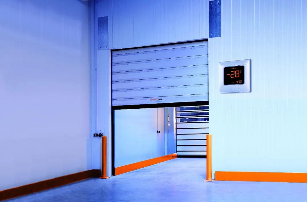 4)卷簾加電動冷庫門。這種設(shè)置是在庫體外側(cè)采用快速卷簾(有的帶保溫或不帶保溫,提升速度為1.2~2.5m/s),可以通過地磁、雷達(dá)、遙控或拉繩開啟,在庫體內(nèi)側(cè)安裝有普通電動冷庫門。在貨物進(jìn)出過程中,電動門一直開啟,靠快速卷簾隔斷庫內(nèi)外,進(jìn)出貨完畢時再將庫內(nèi)側(cè)冷庫門關(guān)閉。這種方式適合于進(jìn)出貨頻繁的冷庫。